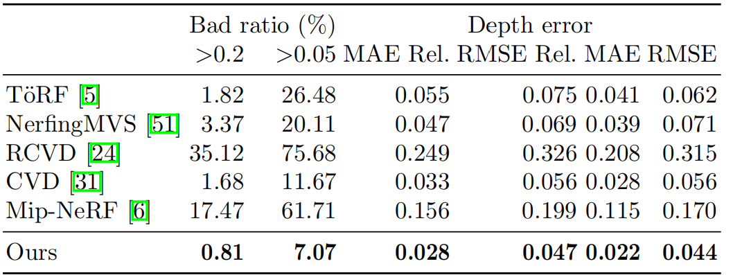上图显示我们的方法可以有效地保留物体细节结构,上表证实了本文的方法可以有效地融合来自ToF测量和多视图数据。虽然 T o ¨ R F T{\ddot{o}}RF To¨RF被设计用来处理ToF输入,但当ToF和RGB分辨率不同时,它的性能比本文的方法更差。对比CVD和RCVD,实验观察到,当增加图像大小时,精度会下降。