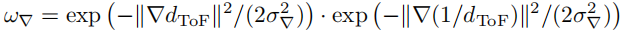 由于ToF在深度不连续处不太可靠,我们认为深度梯度较大的区域不太可靠:
