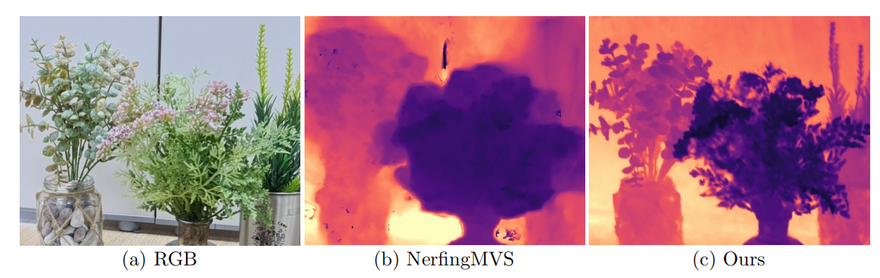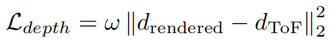 本文使用的是MipNeRF作为多视图深度的baseline。这可以很自然地处理ToF和RGB相机之间的分辨率差异。对于深度监督,本文使用一种简单的方法,类似于VideoNeRF使用多视图三维重建的逆深度图进行监督的思路,我们在优化中添加了一个使用深度样本的损失项: