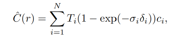 基于学习的双目/ToF融合方法需要训练数据,为此,我们利用多视角RGB图像优化了一个神经辐射场(Nerf),这些数据允许查询场景中的每个点的密度和颜色,从而允许我们渲染估计的深度。具体来说就是下式(Nerf的体素渲染公式)中的颜色项 c i c_i ci 替换为点的深度然后进行渲染
