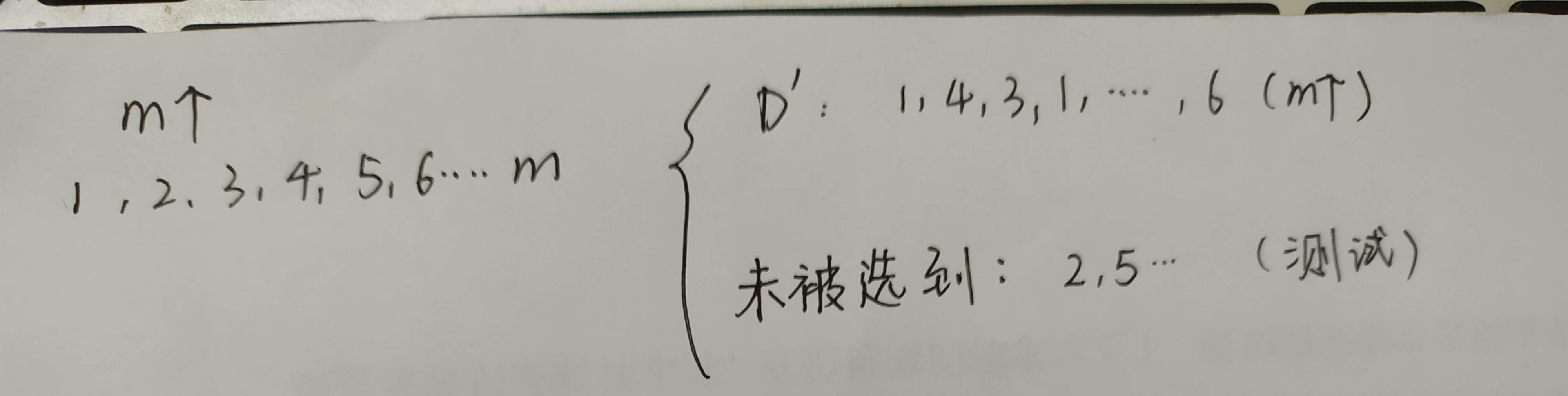 给定包含m个样本的数据集D,我们对它进行采样产生数据集D’:每次随机从D中挑选一个样本,将其拷贝放入D’,然后再将该样本放回初始数据集D中,使得该样本在下次采样时仍有可能被采到;这个过程重复执行m次后,我们就得到了包含m个样本的数据集D’,这就是自助采样的结果.