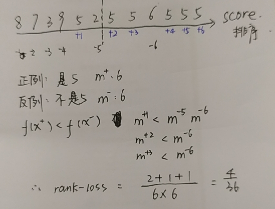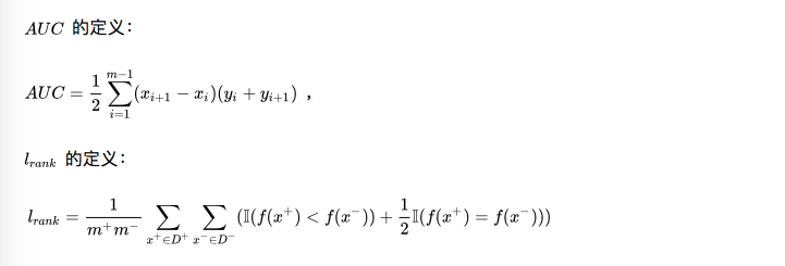 形式化地看,AUC考虑的是样本预测的排序质量,因此它与排序误差有紧密联系.给定m+个正例和m-个反例,令D+和D-分别表示正、反例集合,则排序“损失”(loss)定义为: