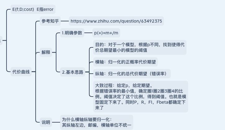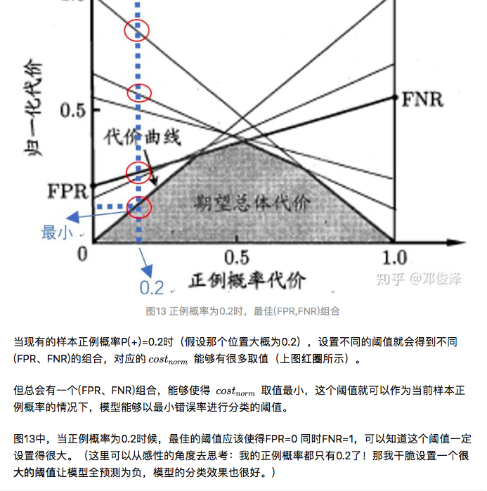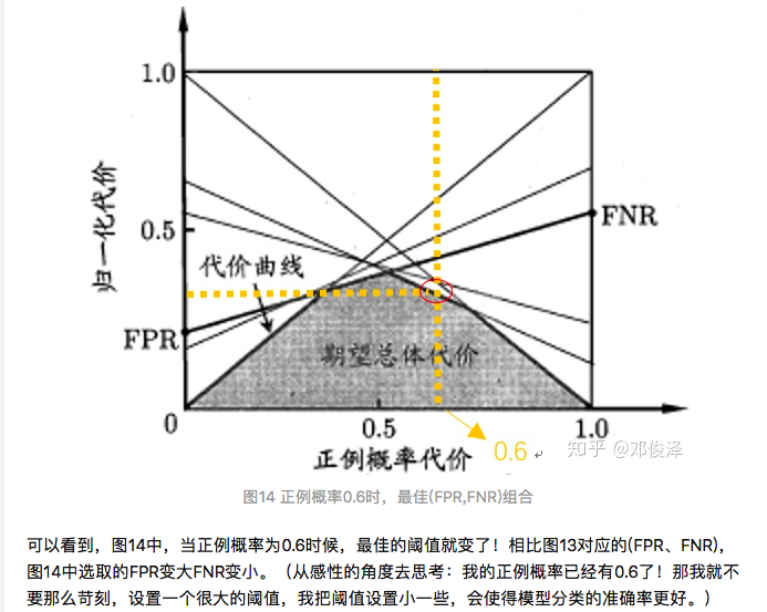 “总结一下:每一个正例概率P(+),模型都能够选择很多阈值对其进行分类,这些分类结果在代价曲线中表现出来的就是不同(FPR、FNR)组合的线段与正例概率的交点,在所有阈值中,至少会有一个阈值(对应唯一的FPR、FNR组合)使得模型能够把样本分类错误率降到最低。”