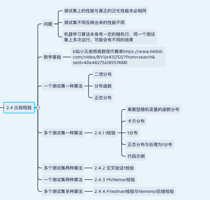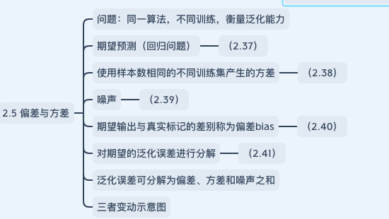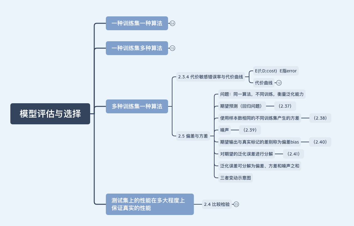 具体来说,对k折交叉验证产生的k对测试错误率:先对每对结果求差,△i=eAi- eBi;若两个学习器性能相同,则差值均值应为零.因此,可根据差值△1,2…△k来对“学习器A与B性能相同”这个假设做t检验,计算出差值的均值μ和方差σ2,在显著度a下,若变量2.5 偏差与方差