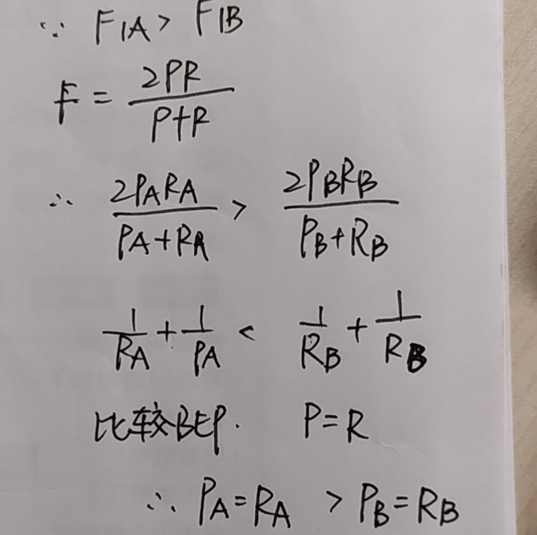 3.若学习器A 的F1 值比学习器B 高,试析A 的BEP 值是否也比B 高.