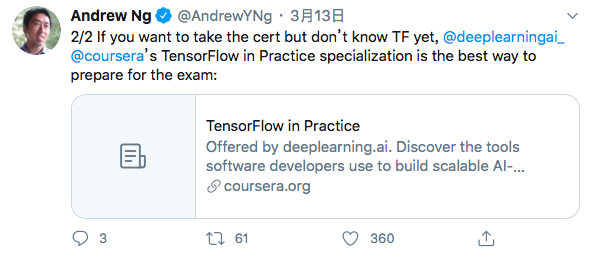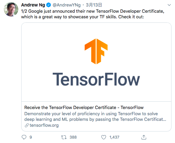 我相信随着谷歌的大力推进,这项认证会逐渐成为职业道路上的必要选择之一,会有越来越多的开发者通过这项认证向企业展现自己的机器学习技能。人工智能和机器学习领域的大神——吴恩达老师也在社交媒体上推荐了这项认证。