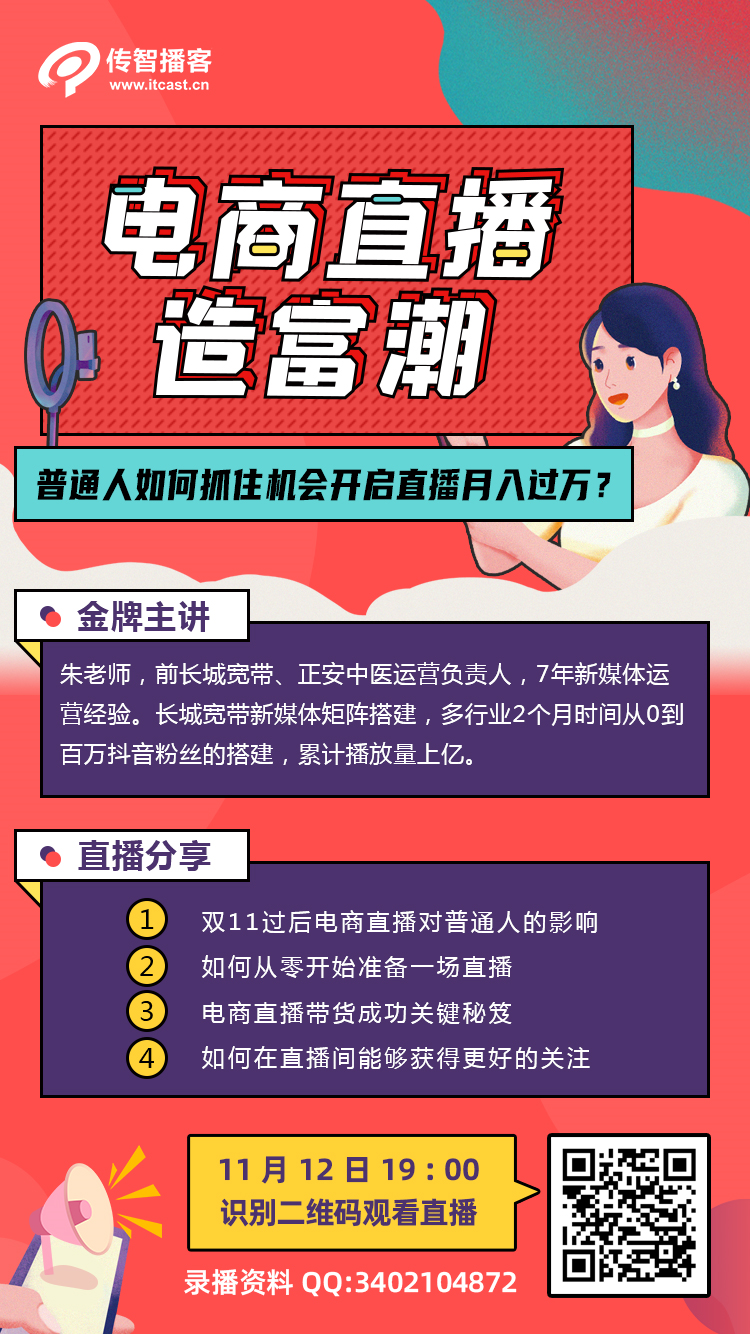对于直播感兴趣的小伙伴,播妞推荐你今晚来听免费公开课——《电商直播造富潮,普通人如何抓住机会开启直播变现?》。此次课程将从主播类型,直播间布置开始讲述,让小白能轻轻松松搞定一场直播,不容错过哦!