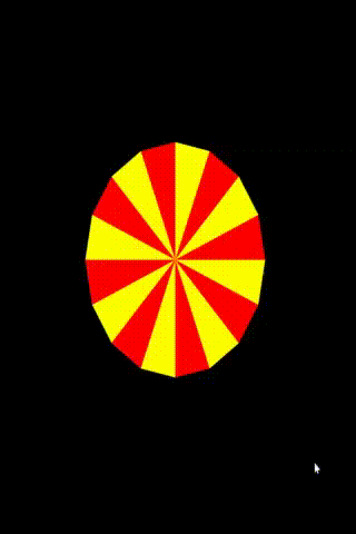public class MyActivity extends Activity {private MyRenderer render;private MyGLSurfaceView view;@Overridepublic void onCreate(Bundle savedInstanceState) {super.onCreate(savedInstanceState);view = new MyGLSurfaceView(this);render = new MyRenderer();view.setRenderer(render);view.setRenderMode(GLSurfaceView.RENDERMODE_WHEN_DIRTY);// 脏渲染,命令渲染setContentView(view);}class MyGLSurfaceView extends GLSurfaceView {public MyGLSurfaceView(Context context) {super(context);}public MyGLSurfaceView(Context context, AttributeSet attrs) {super(context, attrs);}}class MyRenderer implements GLSurfaceView.Renderer {private float ratio, xrotate, yrotate;@Overridepublic void onSurfaceCreated(GL10 gl, EGLConfig config) {// 清屏色gl.glClearColor(0f, 0f, 0f, 1f);// 启用顶点缓冲区gl.glEnableClientState(GL10.GL_VERTEX_ARRAY);// 启用颜色缓冲区gl.glEnableClientState(GL10.GL_COLOR_ARRAY);}@Overridepublic void onSurfaceChanged(GL10 gl, int width, int height) {// 设置视口gl.glViewport(0, 0, width, height);ratio = (float) width / (float) height;// 投影矩阵gl.glMatrixMode(GL10.GL_PROJECTION);// 加载单位矩阵gl.glLoadIdentity();// 设置平截头体gl.glFrustumf(-ratio, ratio, -1, 1, 3f, 7f);}@Overridepublic void onDrawFrame(GL10 gl) {// 清除颜色缓冲区和深度缓冲区gl.glClear(GL10.GL_COLOR_BUFFER_BIT | GL10.GL_DEPTH_BUFFER_BIT);// 设置绘图颜色gl.glColor4f(1f, 0f, 0f, 1f);// 启用深度测试;否则最后绘制底面的始终显示,不管是否被遮挡,总能看见!gl.glEnable(GL10.GL_DEPTH_TEST);// 启用表面剔除gl.glEnable(GL10.GL_CULL_FACE);// CCW:counter clock wise-->逆时针// CW:clock wise--> 顺时针gl.glFrontFace(GL10.GL_CCW);// 指定逆时针为正面(锥面是逆时针绘制的)// 剔除背面(圆锥体里面)gl.glCullFace(GL10.GL_BACK);// GL10.GL_SMOOTH:平滑着色(默认)// GL10.GL_FLAT:单调模式着色gl.glShadeModel(GL10.GL_FLAT);// 操作模型视图矩阵gl.glMatrixMode(GL10.GL_MODELVIEW);gl.glLoadIdentity();// 设置眼球的参数GLU.gluLookAt(gl, 0f, 0f, 5f, 0f, 0f, 0f, 0f, 1f, 0f);// 旋转角度gl.glRotatef(xrotate, 1, 0, 0);gl.glRotatef(yrotate, 0, 1, 0);// 计算点坐标float r = 0.5f;// 半径float x = 0f, y = 0f, z = -0.5f;/******************** 锥面 ************************/// 顶点坐标集合List coordsList = new ArrayList();// 添加锥顶点coordsList.add(0f);coordsList.add(0f);coordsList.add(0.5f);// 顶点颜色集合List colorList = new ArrayList();colorList.add(1f);// rcolorList.add(0f);// gcolorList.add(0f);// bcolorList.add(1f);// a/******************** 锥底 ************************/// 锥底坐标List coordsConeBottomList = new ArrayList();coordsConeBottomList.add(0f);coordsConeBottomList.add(0f);coordsConeBottomList.add(-0.5f);boolean flag = false;// 底面for (float alpha = 0f; alpha < Math.PI * 6; alpha += (float) (Math.PI / 8)) {// 锥面x = (float) (r * Math.cos(alpha));y = (float) (r * Math.sin(alpha));coordsList.add(x);coordsList.add(y);coordsList.add(z);// 锥底坐标coordsConeBottomList.add(x);coordsConeBottomList.add(y);coordsConeBottomList.add(z);// 点颜色值if (flag = !flag) {// 黄色colorList.add(1f);colorList.add(1f);colorList.add(0f);colorList.add(1f);} else {// 红色colorList.add(1f);colorList.add(0f);colorList.add(0f);colorList.add(1f);}}// 在颜色缓冲区增加一个颜色if (flag = !flag) {// 黄色colorList.add(1f);colorList.add(1f);colorList.add(0f);colorList.add(1f);} else {// 红色colorList.add(1f);colorList.add(0f);colorList.add(0f);colorList.add(1f);}// 颜色缓冲区ByteBuffer colorBuffer = list2ByteBuffer(colorList);gl.glColorPointer(4, GL10.GL_FLOAT, 0, colorBuffer);// 绘制锥面gl.glVertexPointer(3, GL10.GL_FLOAT, 0, list2ByteBuffer(coordsList));gl.glDrawArrays(GL10.GL_TRIANGLE_FAN, 0, coordsList.size() / 3);// 锥底也是逆时针绘制,是从锥体里面绘制的,所以要剔除正面,留背面(即外底表面可视表面)gl.glCullFace(GL10.GL_FRONT);// 绘制锥底colorBuffer.position(4 * 4);//单位:字节(字节缓冲区),定位到:4个分量×floatSize,即下一个颜色//如果是浮点缓冲区,则position()参数值为4.gl.glColorPointer(4, GL10.GL_FLOAT, 0, colorBuffer);gl.glVertexPointer(3, GL10.GL_FLOAT, 0, list2ByteBuffer(coordsConeBottomList));gl.glDrawArrays(GL10.GL_TRIANGLE_FAN, 0, coordsConeBottomList.size() / 3);}}private ByteBuffer list2ByteBuffer(List list) {ByteBuffer ibb = ByteBuffer.allocateDirect(list.size() * 4);ibb.order(ByteOrder.nativeOrder());FloatBuffer fbb = ibb.asFloatBuffer();for (Float f : list) {fbb.put(f);}ibb.position(0);return ibb;}@Overridepublic boolean onKeyDown(int keyCode, KeyEvent event) {float step = 5f;if (keyCode == KeyEvent.KEYCODE_DPAD_UP) {render.xrotate -= step;} else if (keyCode == KeyEvent.KEYCODE_DPAD_DOWN) {render.xrotate += step;} else if (keyCode == KeyEvent.KEYCODE_DPAD_LEFT) {render.yrotate += step;} else if (keyCode == KeyEvent.KEYCODE_DPAD_RIGHT) {render.yrotate -= step;}// 请求渲染,和脏渲染配合使用view.requestRender();return super.onKeyDown(keyCode, event);}