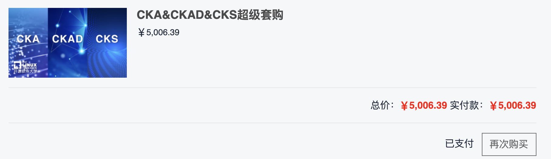 今年6.18一顿剁手后 励志发奋图强,不能这样麻木的浑浑噩噩下去了,考证学习 奥利给!!!先看看证书吧,本人搞运维的对k8s还是有比较熟悉 看了相关资料 决定先从这里下手,付款时还一顿犹豫,最后 要改变 要突破~~~ 付款了 草鸡套餐