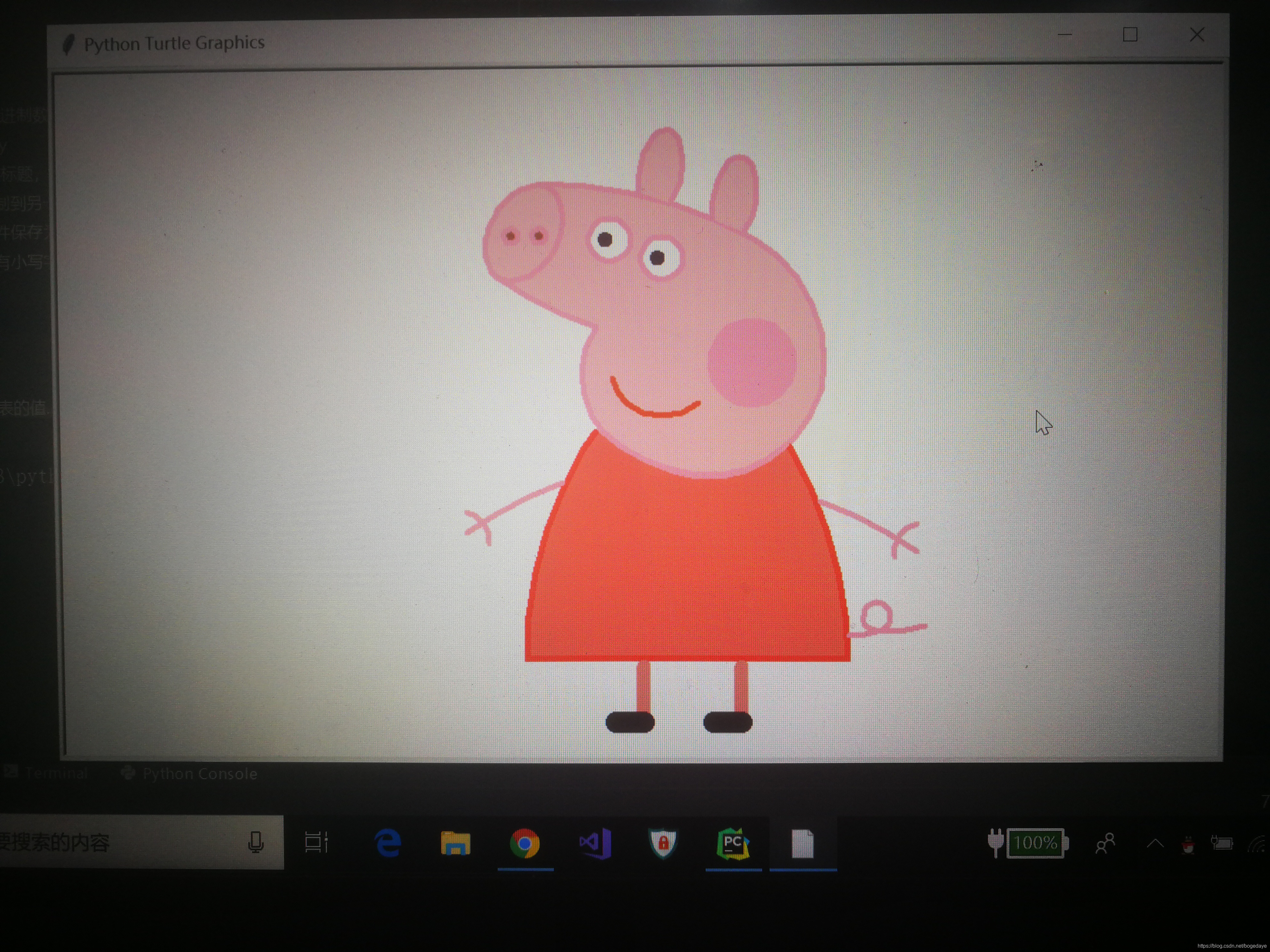 from turtle import*def nose(x,y):#鼻子pu()goto(x,y)pd()seth(-30)begin_fill()a=0.4for i in range(120):if 0<=i<30 or 60<=i<90:a=a+0.08lt(3) #向左转3度fd(a) #向前走a的步长else:a=a-0.08lt(3)fd(a)end_fill()pu()seth(90)fd(25)seth(0)fd(10)pd()pencolor(255,155,192)seth(10)begin_fill()circle(5)color(160,82,45)end_fill()pu()seth(0)fd(20)pd()pencolor(255,155,192)seth(10)begin_fill()circle(5)color(160,82,45)end_fill()def head(x,y):#头color((255,155,192),"pink")pu()goto(x,y)seth(0)pd()begin_fill()seth(180)circle(300,-30)circle(100,-60)circle(80,-100)circle(150,-20)circle(60,-95)seth(161)circle(-300,15)pu()goto(-100,100)pd()seth(-30)a=0.4for i in range(60):if 0<=i<30 or 60<=i<90:a=a+0.08lt(3) #向左转3度fd(a) #向前走a的步长else:a=a-0.08lt(3)fd(a)end_fill()def ears(x,y): #耳朵color((255,155,192),"pink")pu()goto(x,y)pd()begin_fill()seth(100)circle(-50,50)circle(-10,120)circle(-50,54)end_fill()pu()seth(90)fd(-12)seth(0)fd(30)pd()begin_fill()seth(100)circle(-50,50)circle(-10,120)circle(-50,56)end_fill()def eyes(x,y):#眼睛color((255,155,192),"white")pu()seth(90)fd(-20)seth(0)fd(-95)pd()begin_fill()circle(15)end_fill()color("black")pu()seth(90)fd(12)seth(0)fd(-3)pd()begin_fill()circle(3)end_fill()color((255,155,192),"white")pu()seth(90)fd(-25)seth(0)fd(40)pd()begin_fill()circle(15)end_fill()color("black")pu()seth(90)fd(12)seth(0)fd(-3)pd()begin_fill()circle(3)end_fill()def cheek(x,y):#腮color((255,155,192))pu()goto(x,y)pd()seth(0)begin_fill()circle(30)end_fill()def mouth(x,y): #嘴color(239,69,19)pu()goto(x,y)pd()seth(-80)circle(30,40)circle(40,80)def body(x,y):#身体color("red",(255,99,71))pu()goto(x,y)pd()begin_fill()seth(-130)circle(100,10)circle(300,30)seth(0)fd(230)seth(90)circle(300,30)circle(100,3)color((255,155,192),(255,100,100))seth(-135)circle(-80,63)circle(-150,24)end_fill()def hands(x,y):#手color((255,155,192))pu()goto(x,y)pd()seth(-160)circle(300,15)pu()seth(90)fd(15)seth(0)fd(0)pd()seth(-10)circle(-20,90)pu()seth(90)fd(30)seth(0)fd(237)pd()seth(-20)circle(-300,15)pu()seth(90)fd(20)seth(0)fd(0)pd()seth(-170)circle(20,90)def foot(x,y):#脚pensize(10)color((240,128,128))pu()goto(x,y)pd()seth(-90)fd(40)seth(-180)color("black")pensize(15)fd(20)pensize(10)color((240,128,128))pu()seth(90)fd(40)seth(0)fd(90)pd()seth(-90)fd(40)seth(-180)color("black")pensize(15)fd(20)def tail(x,y):#尾巴pensize(4)color((255,155,192))pu()goto(x,y)pd()seth(0)circle(70,20)circle(10,330)circle(70,30)def setting(): #参数设置pensize(4)hideturtle()colormode(255)color((255,155,192),"pink")setup(840,500)speed(10)def main():setting() #画布、画笔设置nose(-100,100) #鼻子head(-69,167) #头ears(0,160) #耳朵eyes(0,140) #眼睛cheek(80,10) #腮mouth(-20,30) #嘴body(-32,-8) #身体hands(-56,-45) #手foot(2,-177) #脚tail(148,-155) #尾巴done() #结束