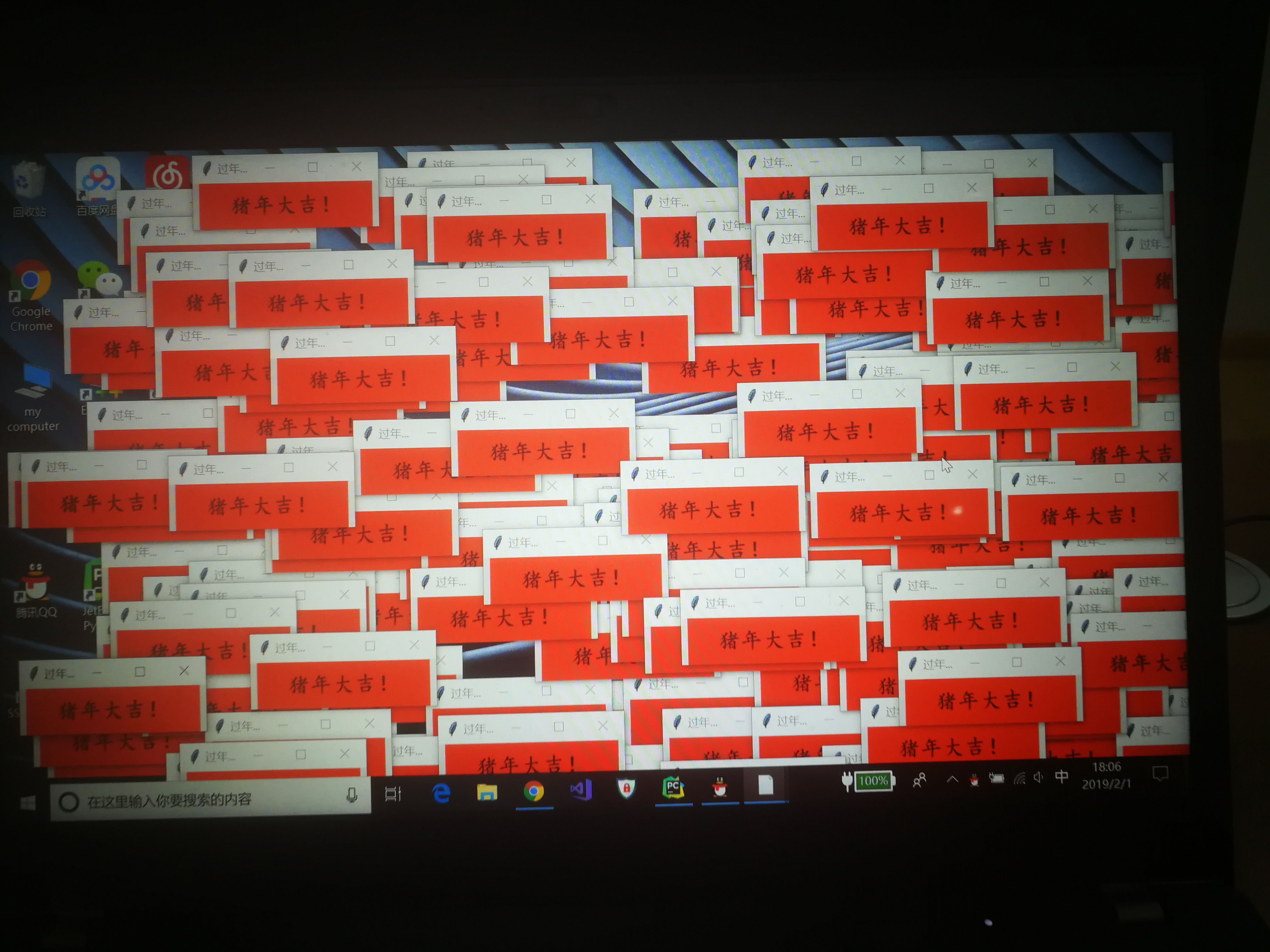 def dow():window = tk.Tk()width = window.winfo_screenwidth()height = window.winfo_screenheight()a = random.randrange(0, width)b = random.randrange(0, height)window.title('过年啦!')window.geometry("200x50" + "+" + str(a) + "+" + str(b))tk.Label(window,text='猪年大吉!', # 标签的文字bg='Red', # 背景颜色font=('楷体', 17), # 字体和字体大小width=15, height=2 # 标签长宽).pack() # 固定窗口位置window.mainloop()