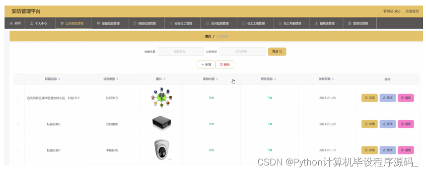 技防信息管理,在技防信息管理页面中可以对技防名称、技防类型、技防图片、技防视频、发布日期等信息进行详情,修改或删除等操作,如图5-5所示。