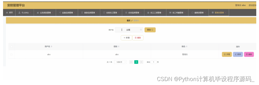 管理员管理,在管理员管理页面中可以对用户名、密码、角色等信息进行详情,修改或删除等操作,如图5-11所示。