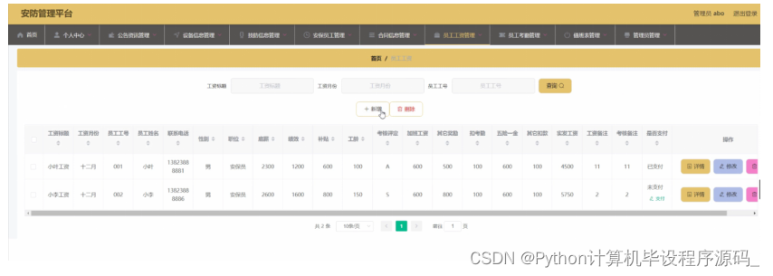 员工工资管理,在员工工资管理页面中可以对工资标题、工资月份、员工工号、员工姓名、联系电话、性别、职位、底薪、绩效、补贴、工龄、考核评定、加班工资、其它奖励、扣考勤、五险一金、其它扣款、实发工资、工资备注、考核备注、是否支付等信息进行详情,修改或删除等操作,如图5-8所示。