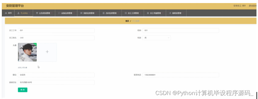 个人中心,在个人中心页面通过填写员工工号、密码、员工姓名、性别、头像、职位、联系电话、家庭住址等信息进行个人信息修改操作,如图5-13所示。