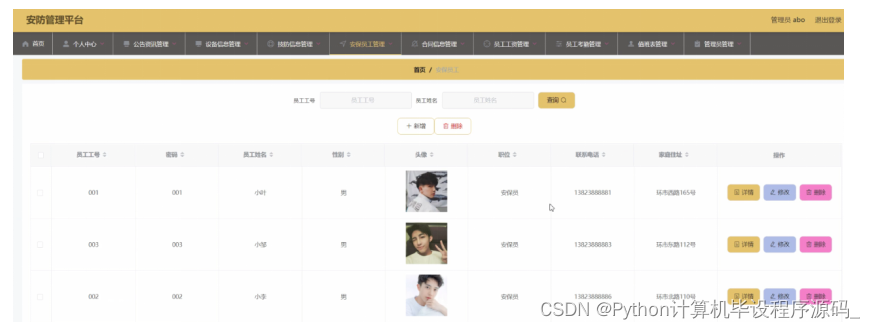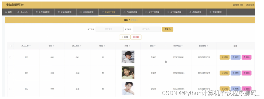 安保员工管理,在安保员工管理页面中可以对员工工号、密码、员工姓名、性别、头像、职位、联系电话、家庭住址等信息进行详情,修改或删除等操作,如图5-6所示。