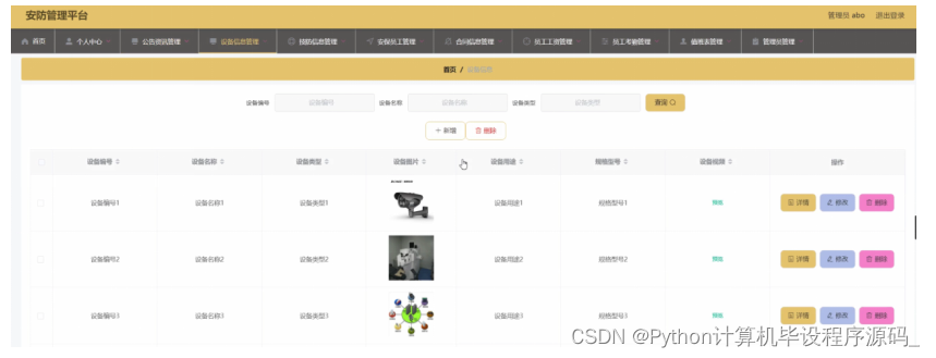 设备信息管理,在设备信息管理页面中可以对设备编号、设备名称、设备类型、设备图片、设备用途、规格型号、设备视频等信息进行详情,修改或删除等操作,如图5-4所示。