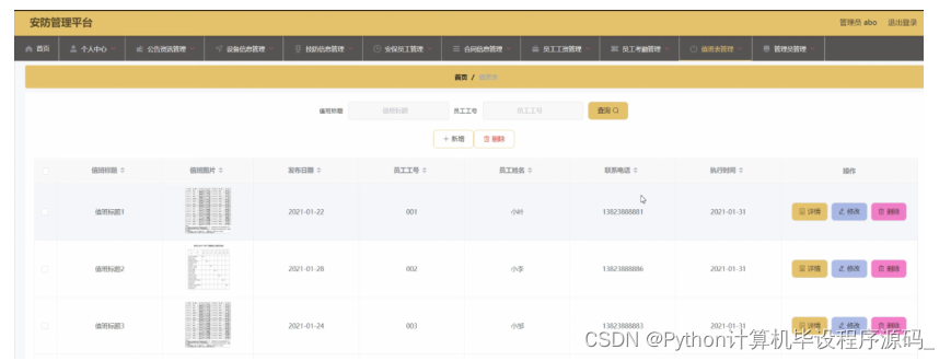值班表管理,在值班表管理页面中可以对值班标题、值班图片、发布日期、员工工号、员工姓名、联系电话、执行时间等信息进行详情,修改或删除等操作,如图5-10所示。
