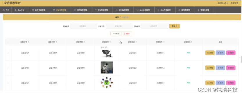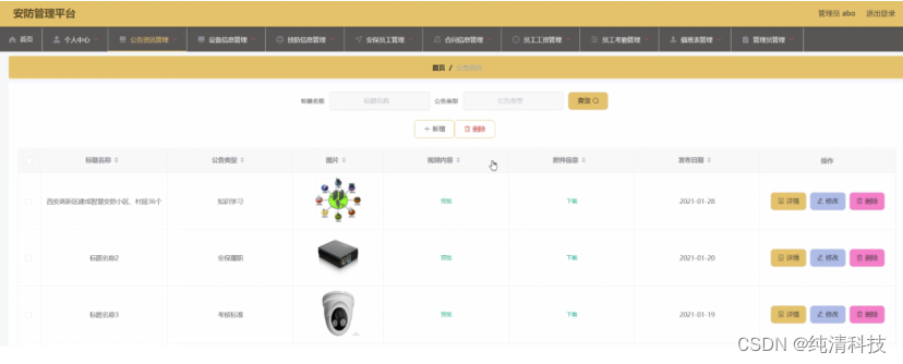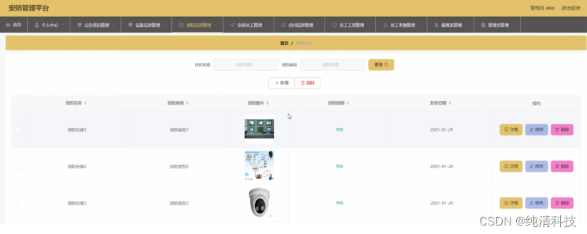 技防信息管理,在技防信息管理页面中可以对技防名称、技防类型、技防图片、技防视频、发布日期等信息进行详情,修改或删除等操作,如图5-5所示。