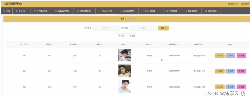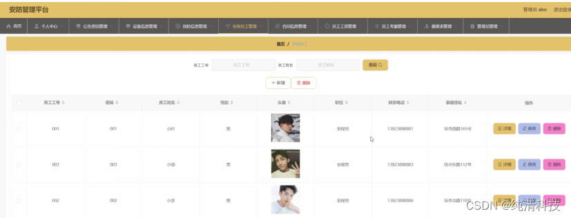 安保员工管理,在安保员工管理页面中可以对员工工号、密码、员工姓名、性别、头像、职位、联系电话、家庭住址等信息进行详情,修改或删除等操作,如图5-6所示。