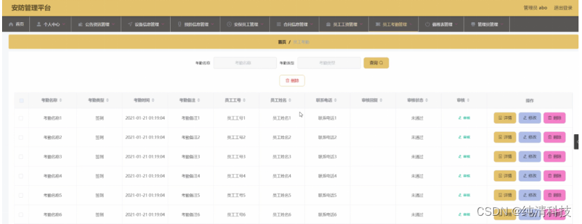 员工考勤管理,在员工考勤管理页面中可以对考勤名称、考勤类型、考勤时间、考勤备注、员工工号、员工姓名、联系电话、审核回复、审核状态、审核等信息进行详情,修改或删除等操作,如图5-9所示。