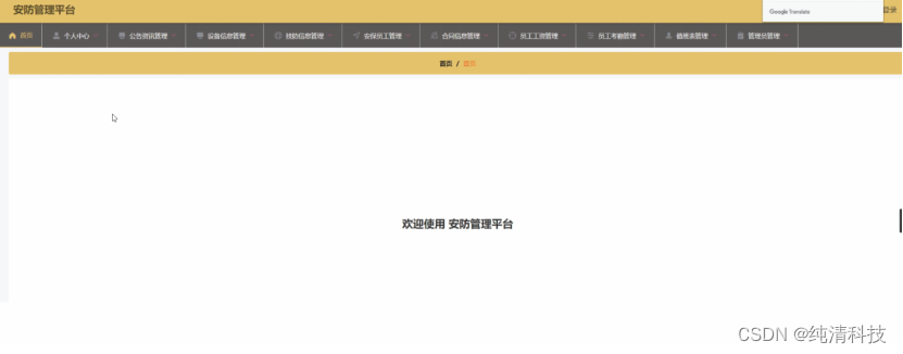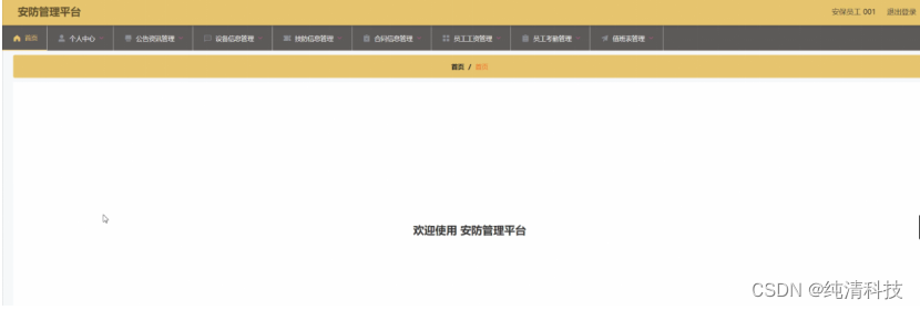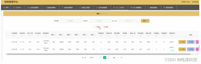 管理员登录进入安防管理平台之后,就可以对所有的信息进行查看,可以查看到首页、个人中心、公告资讯管理、设备信息管理、技防信息管理、安保员工管理、合同信息管理、员工工资管理、员工考勤管理、值班表管理、管理员管理等,并且还可以对其进行相应的操作管理,如图5-2所示。