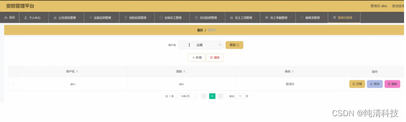管理员管理,在管理员管理页面中可以对用户名、密码、角色等信息进行详情,修改或删除等操作,如图5-11所示。