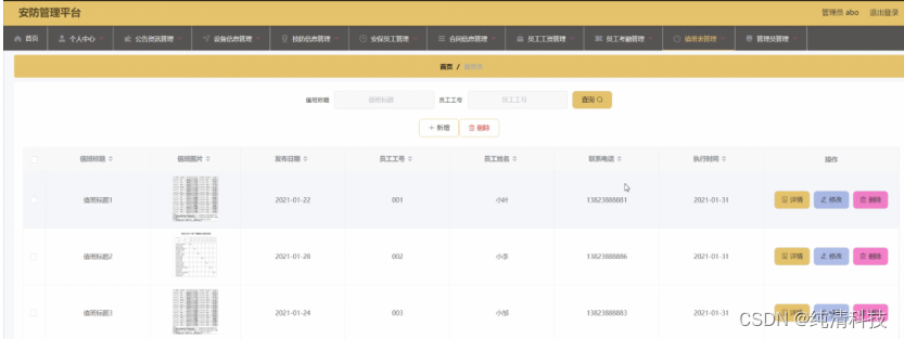 值班表管理,在值班表管理页面中可以对值班标题、值班图片、发布日期、员工工号、员工姓名、联系电话、执行时间等信息进行详情,修改或删除等操作,如图5-10所示。