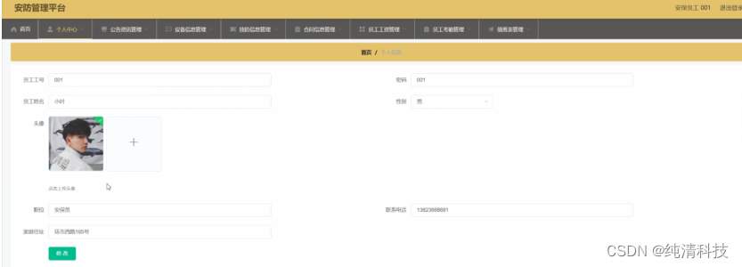 个人中心,在个人中心页面通过填写员工工号、密码、员工姓名、性别、头像、职位、联系电话、家庭住址等信息进行个人信息修改操作,如图5-13所示。
