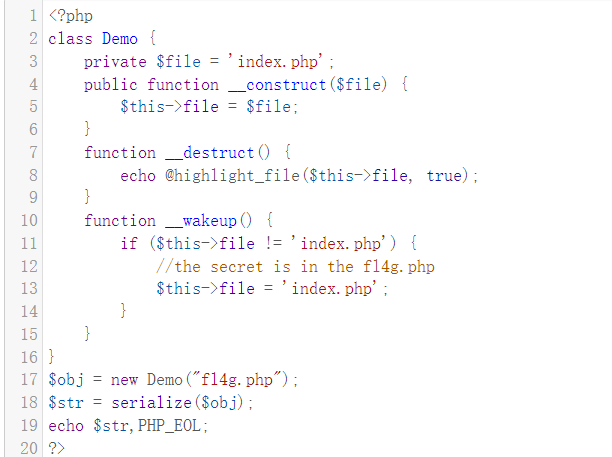 file = $file; #在调用对象之前,给$file属性初始化赋值}function __destruct() { #定义一个__destruct()析构方法echo @highlight_file($this->file, true); #在销毁对象之前,高亮打印出$file属性的源码}function __wakeup() { #定义一个__wakeup()魔术方法if ($this->file != 'index.php') { #在对象反序列化的时候,判断$file属性的值是否为index.php//the secret is in the fl4g.php #提示flag在一个以fl4g.php为名的php文件里$this->file = 'index.php'; #若$file属性不等于index.php,则赋值为index.php} }