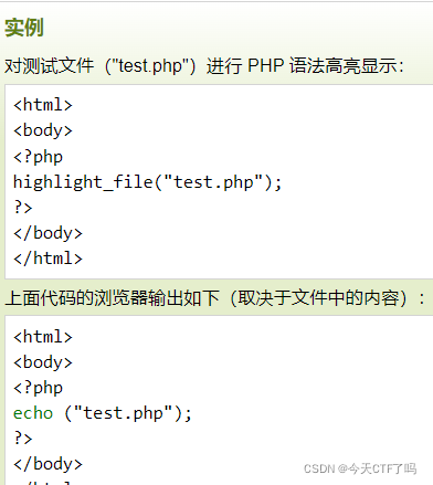 highlight_file() 函数对文件进行 PHP 语法高亮显示。语法通过使用 HTML 标签进行高亮。