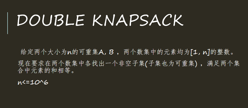 Wunder Fund Round 2016 (Div. 1 + Div. 2 combined) F. Double Knapsack(构造)