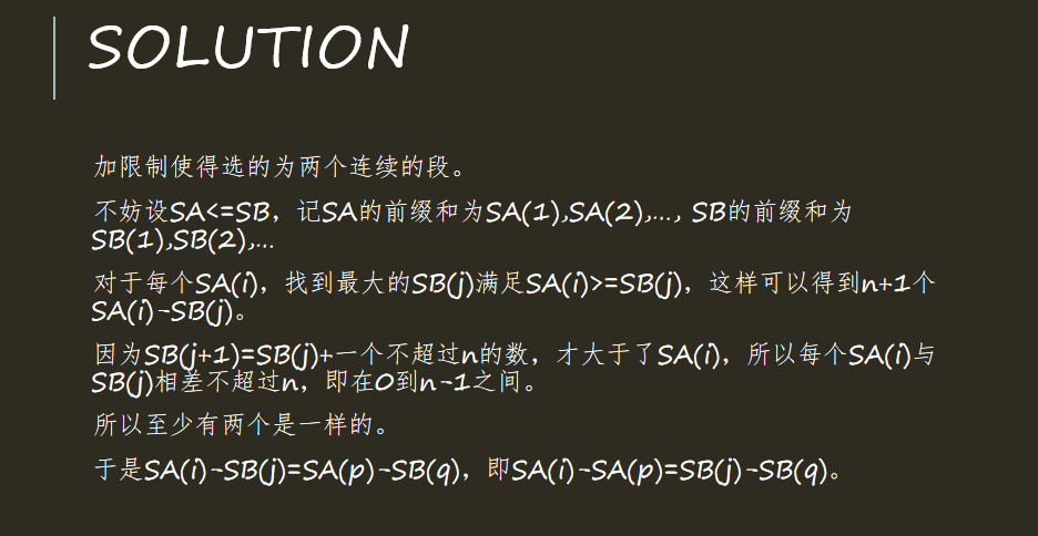 int main(){scanf("%d",&n);for(int i=1;i<=n;++i){scanf("%lld",&a[i]);a[i]+=a[i-1];}for(int i=1;i<=n;++i){scanf("%lld",&b[i]);b[i]+=b[i-1];}if(a[n]>b[n]){swap(a,b);swp=1;}int x=0;memset(pa,-1,sizeof pa);for(int i=0;i<=n;++i){while(x+1<=n && b[x+1]<=a[i]){x++;}int r=a[i]-b[x];//remainderif(~pa[r]){out(pa[r],i,pb[r],x);return 0;}pa[r]=i;pb[r]=x;}return 0;
