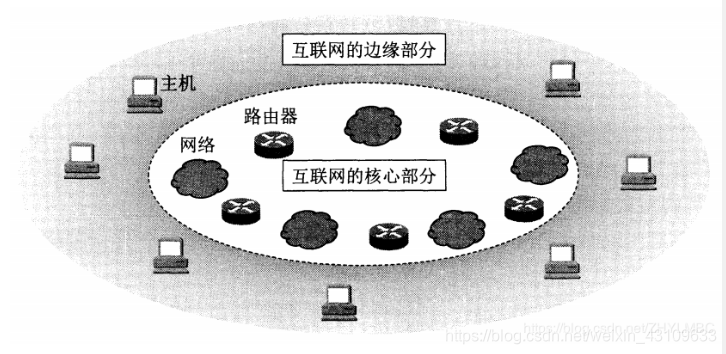 边缘部分:由所有连接在互联网上的主机组成。这部分是用户直接使用的,用来进行通信(传送数据、音频或视频)和资源共享。