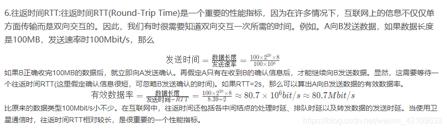 6.往返时间RTT:往返时间RTT(Round-Trip Time)是一个重要的性能指标,因为在许多情况下,互联网上的信息不仅仅单方面传输而是双向交互的。因此,我们有时很需要知道双向交互一次所需的时间。例如。A向B发送数据,如果数据长度是100MB,发送速率时100Mbit/s,那么