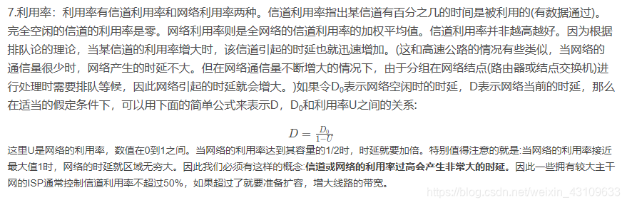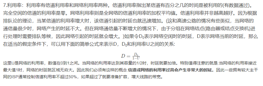 4.时延:时延是指数据(一个保温或分组,甚至比特)从网络(或链路)的一段传送到另一端所需的时间。时延是个很重要的性能指标,它有时也称为延迟或迟延。网络中的时延是由以下几个不同的部分组成的: