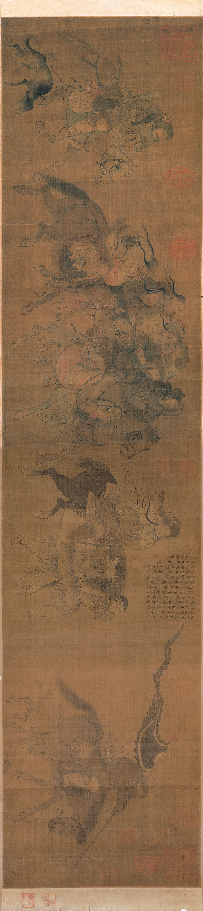 画左上方署款“祗应司张瑀画”。卷上有清高宗乾隆亲笔题签:“宋人文姬归汉图”,下注“内府鉴定”四字,钤“神品”、“乾隆宸翰”两印。乾隆帝赏画之余,意犹未尽,还在卷上题诗记之。诗末押“比德”、“朗润”两个小方印。前端有明万历“皇帝图书”、“宝玩之记”两印,后端书款处有“万历之玺”一印,还有乾隆、嘉庆、宣统诸鉴藏印。
