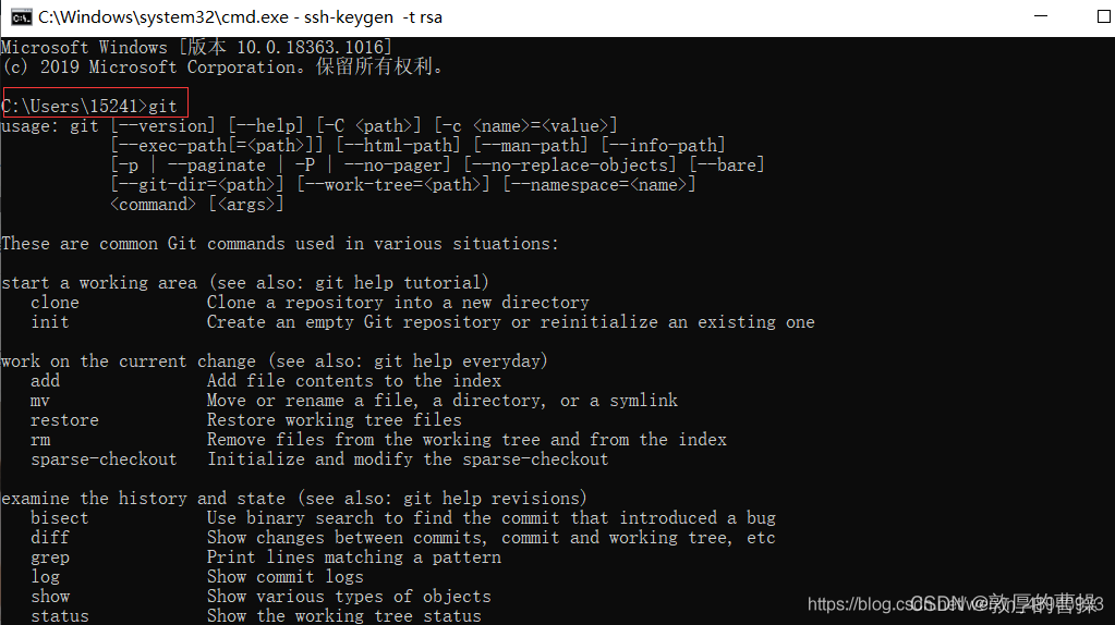 win + r 然后在弹出框中出入cdm,弹出如下界面,输入git,回车。出现以下页面说明安装成功