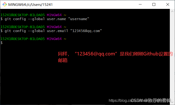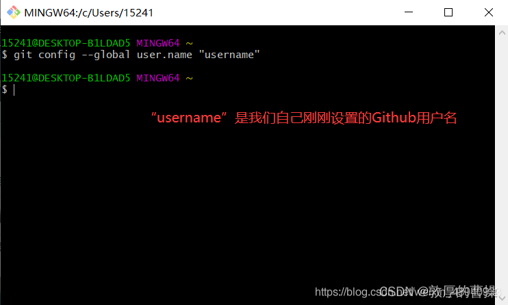 7、点击桌面上的Git Bash快捷图标,输入以下命令按回车,来配置用户名
