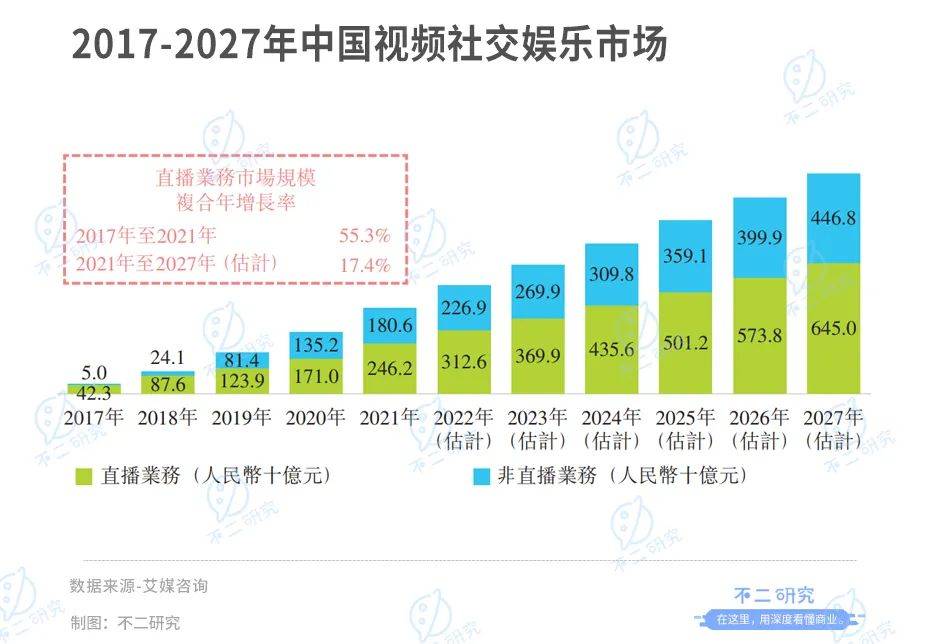 据艾瑞咨询报告数据显示,中国视频直播市场预期将以2021年至2027年间17.4%的复合年增长率,于2027年达至6450亿元。