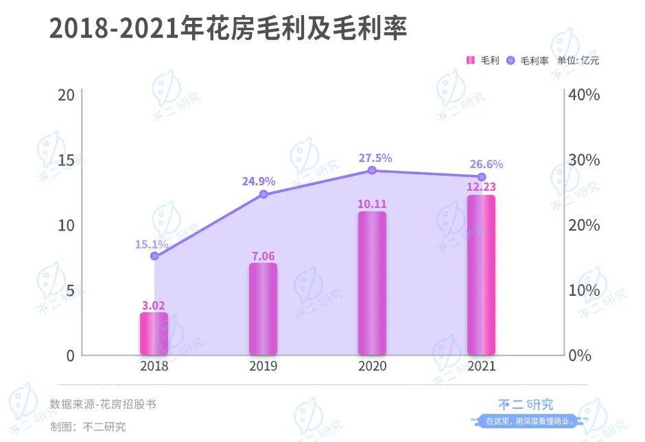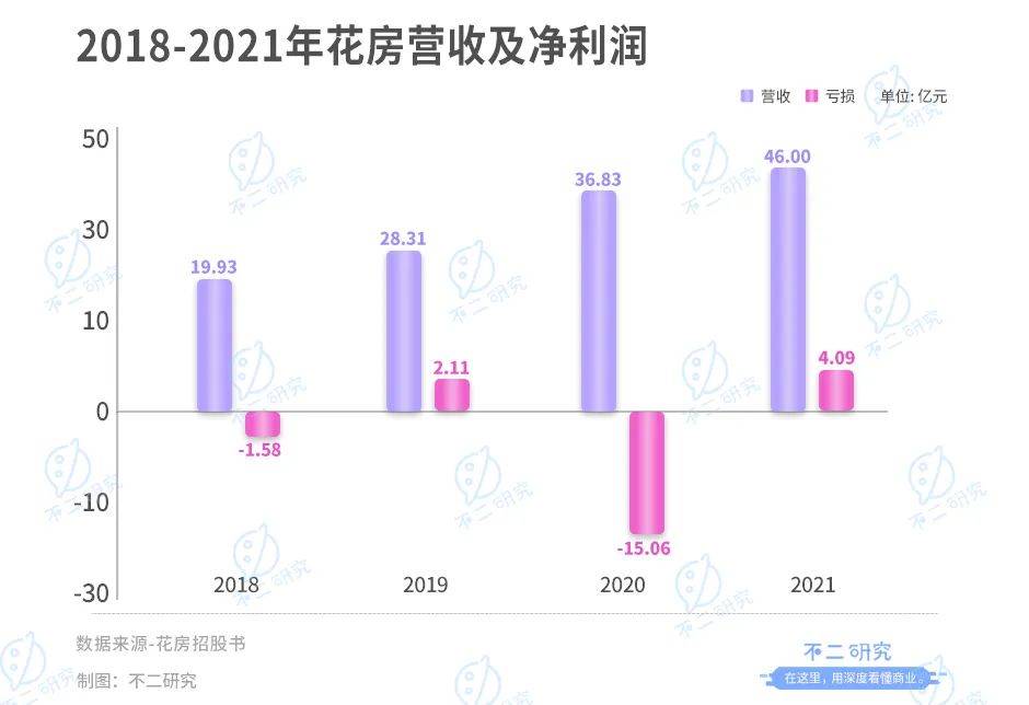 招股书显示,2018-2021年花房的收入分别为19.93亿元、28.31亿元、36.83亿元、46.00亿元,营收一直处于稳步上涨趋势。