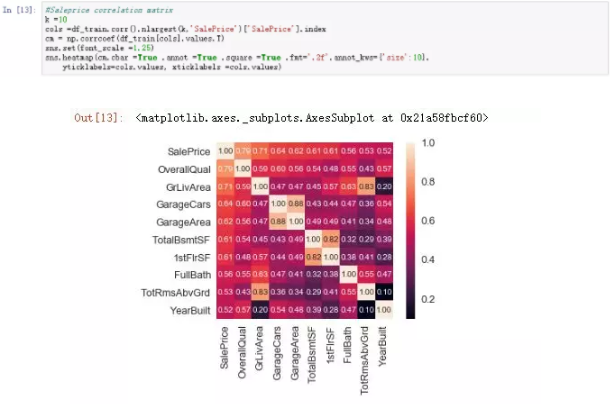 根据数字大小,得出相关性前十的特征:OveralQual , GrLivArea, GarageCars , GarageArea ,TotalBsmtSF, 1stFlrSF ,FullBath, TotRmsAbvGrd ,YearBuilt 。
