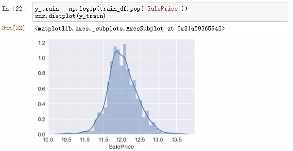 使之尽量成正太分布形式。使用log,并单独作为y ,且从数据中移除(pop)。