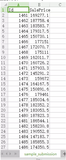 提交结果时要知道结果是什么形式,我们打开官方提交结果样式,如下,需要保存为.csv格式,且只有Id,和对应的房价SalePrice。