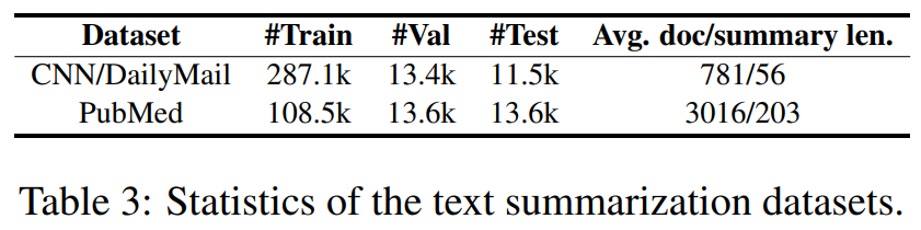 下表 3 为文本摘要数据集 CNN/DailyMail 和 PubMed。