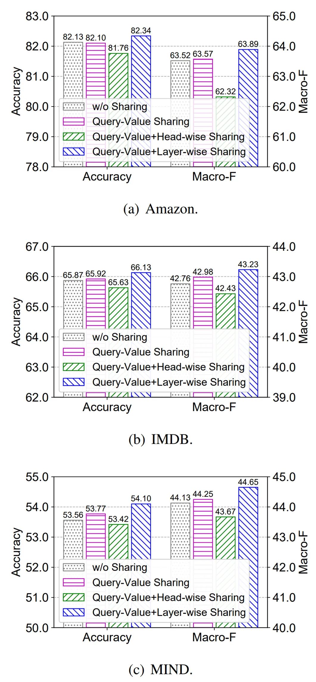 最后,研究者探究了不同参数共享方法对 Fastformer 性能的影响,这些方法包括共享查询和值变换矩阵、在不同注意力头之间共享参数和在不同层之间共享参数。结果如下图 4 所示,他们发现当使用查询 - 值参数共享时,Fastformer 模型的性能媲美或略优于未使用任何参数共享方法的情况。