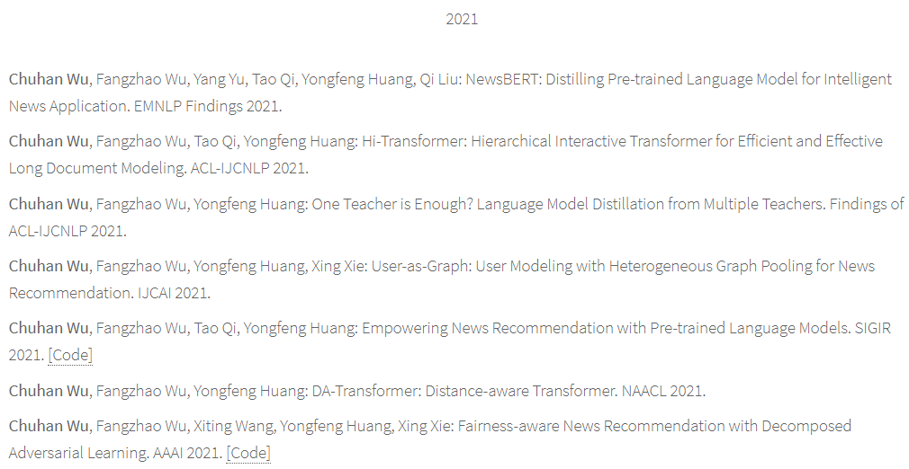 该论文一作为武楚涵(Chuhan Wu),他是清华大学电子工程系博士研究生。武楚涵主要研究方向包括推荐系统、用户建模和社交媒体挖掘。他在人工智能、自然语言处理和数据挖掘领域相关会议和期刊上发表了多篇论文。仅 2021 年,他就发表了 7 篇顶会接收论文。