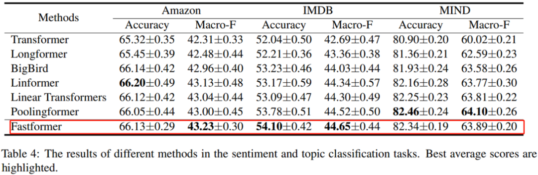 研究者在 Amazon、IMDB 和 MIND 三个分类数据集上,对 Fastformer 与 Transformer、Longformer、BigBird、Linformer 以及 Linear Transformer 和 Poolingformer 等基准方法的性能进行了比较。
