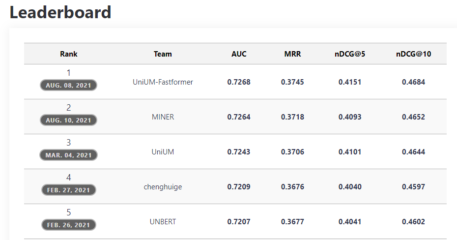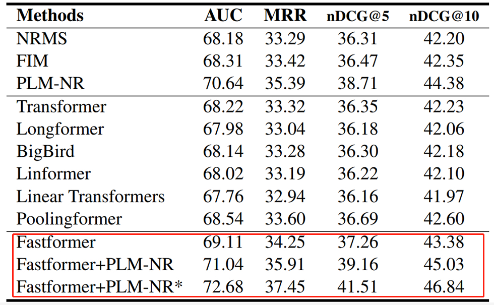 此外,Fastformer 进一步提升了 PLM-NR 的性能,两者组合的模型在 MIND 排行榜上实现了最佳结果。这些结果表明,Fastformer 不仅在文本建模方面非常高效,在理解用户兴趣方面也表现出色。
