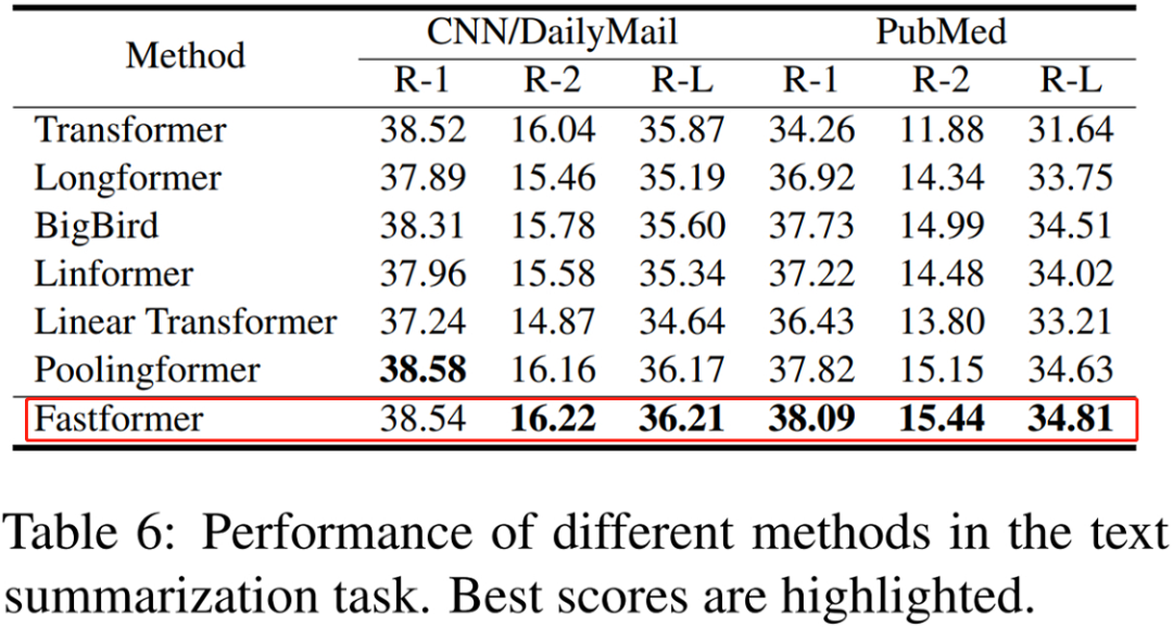 研究者在 CNN/DailyMail 和 PubMed 两个文本摘要任务上比较了 Fastformer 与其他 Transformer 变体模型在自然语言生成中的有效性。结果如下表 6 所示,Fastformer 在大多数指标上都实现了 SOTA 性能,显示出其在自然语言生成中的优势。